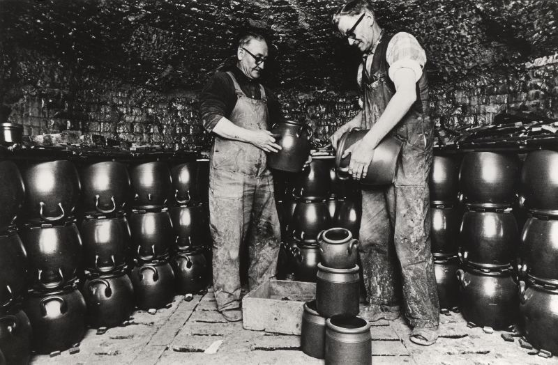 fotografi, Olof Nilsson och Hugo Anderberg slår bort lerbrickor i ugnen i Raus Stenkärlsfabrik 1970-t.