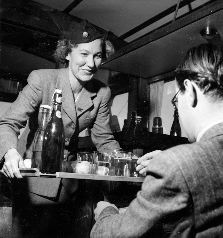 Fotografi av hur Linjebuss värdinna serverar en passagerare dryck.