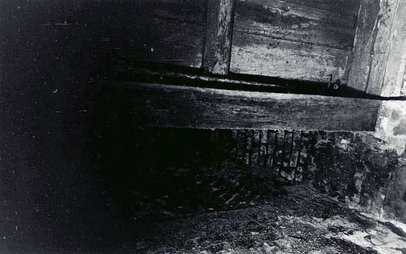 Beskrivning: Bunkagården år 1971. Timrad stuga, skorstenen invändigt, foto från köket.
