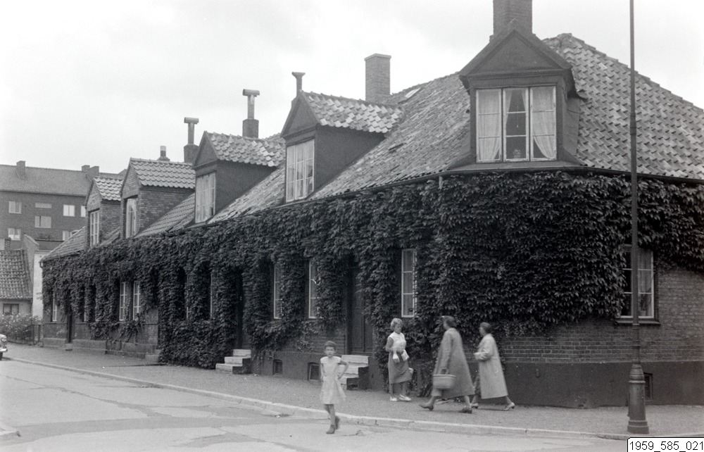 Bilden föreställer en stadsmiljö. I förgrunden en gata med grusad trottoar. I bakgrunden ett enplanshus till stor del täckt av murgröna (?). På trottoaren några promenerande kvinnor och en flicka.
