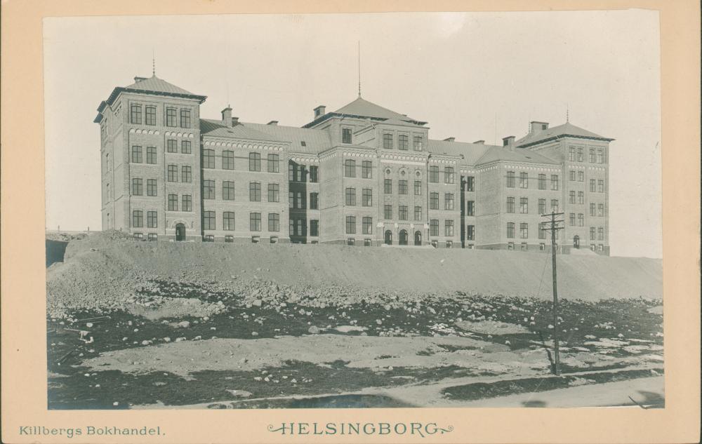 Fotot visar den nybyggda Gustav Adolfsskolan, som invigdes år 1900, uppe på sin höjd. Platsen framför, nedanför är obebyggd och består av grus, stenar och lite markväxtlighet. Där syns också en mast (tele eller el).