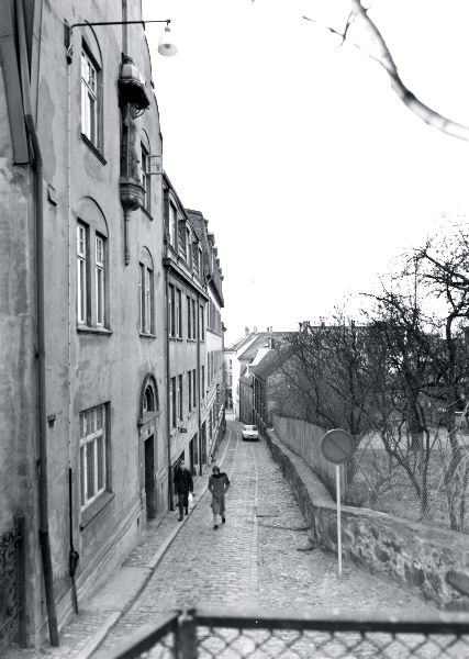 Bild av Himmelriksgränden, två personer på väg uppåt, en bil som står parkerad, husen till vänster finns idag men till höger lite annorlunda .