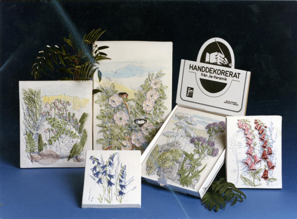 Fotografi föreställande keramiktavlor med blommotiv formgivna av Aimo Nietosvuori för AB Jie Johnson. Noterat på baksidan: Aimos.
