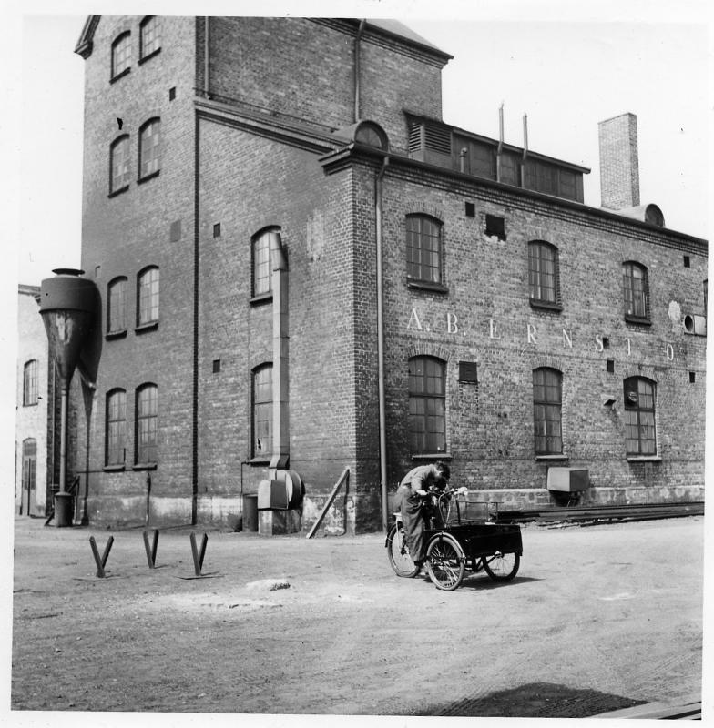 Svartvitt fotografi föreställande Cykelfabriken Kärnans fabrik/industribyggnad. Byggnaden är skyltad med " AB ERNST O. JÖNSSON" (det sista syns ej på bilden). Rakt fram i bild syns en arbetare sittandes på en trehjuling med motor.