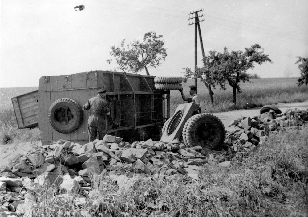 En lastbil har vält. Två män ser ut att reparera bilen.