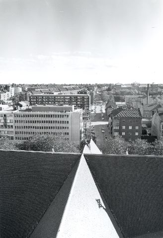 svartvitt fotografi föreställande utsikt från Gustav Adolfskyrkan, kvarter Danmark norra och Amerika, Nytorgsgatan. År 1970.
