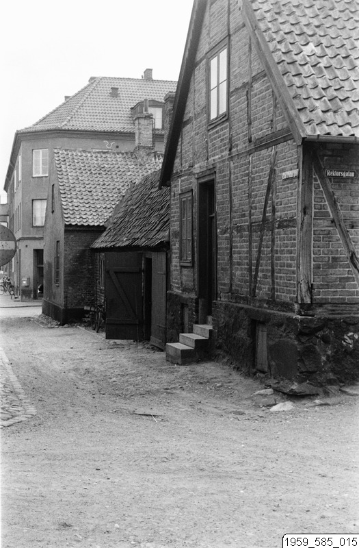 Bilden föreställer en stadsmiljö. I förgrunden en grusad gård, eller en grusad gata. I bakgrunden enplanshus och flerplanshus. Det närmaste ett korsvirkeshus med en trappa.