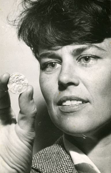 Margareta Weidhagen visar upp ett mynt som är fynd från en utgrävning.
