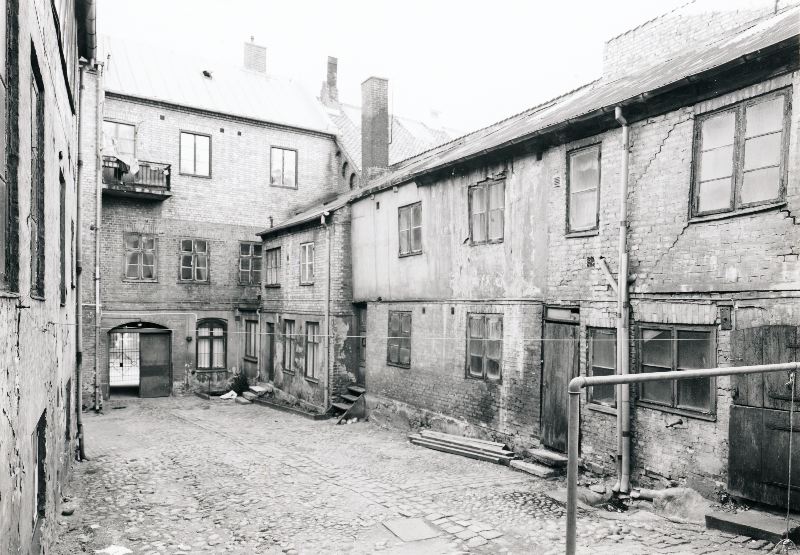 Bilden visar en gårdsinteriör med ett trevåningshus i bakgrunden på Södra Storgatan 33. Till höger syns ett tvåvåningshus i tegel med sprickor i fasaden och hög skorsten.