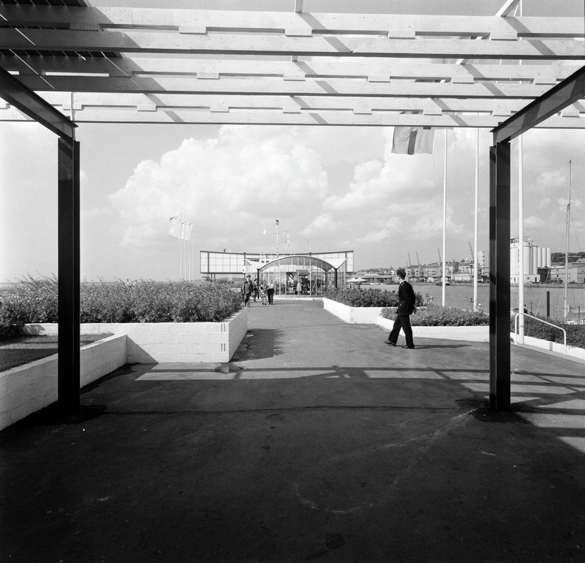 Bilden föreställer i förgrunden ett litet överbyggt torg. Där bakom inmurade planteringar med buskar. Långt i bakgrunden en paviljong. En person står mitt i bilden.