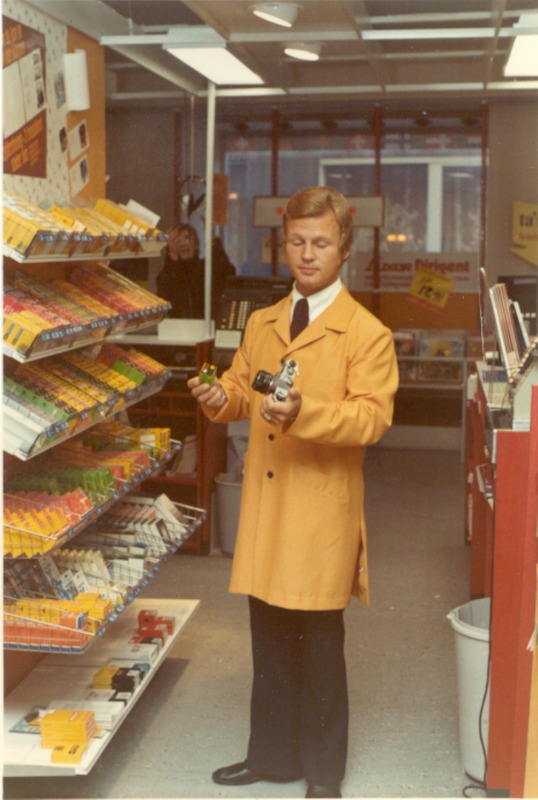 Färgfotografi fråm 1970-11-10 som troligen avbildar insidan av Hefomas affär på Stortorget 16. Här ser vi Hans Pohlman hållandes i en kamera. Se även DIG_2020_1017 för en variant av denna bild, se även DIG_2020_1018 som verkar ha tagits vid samma tidpunkt.