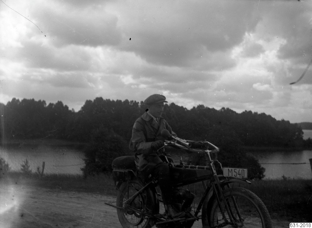 Bilden föreställer en man på en motorcykel. I bakgrunden en sjö och i sjön ligger en ö med skog på. Mellan motorcykeln och shjön växer gräs.