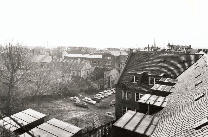 Panoramabild över Minervakvarteret år 1971. I förgrunden syns taket och en del av en flervåningsbyggnad. Till vänster syns andra byggnader i olika stil. Mellan de två grupperna av byggnader syns parkerade bilar.