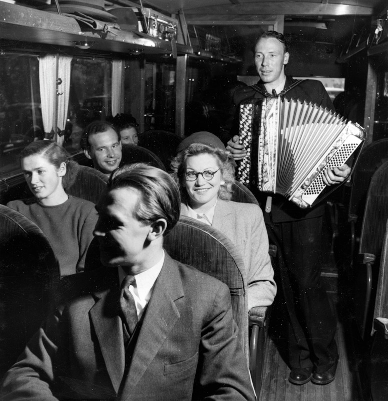 Fotografi av en man som underhåller passagerare på Linjeuss med dragspel.