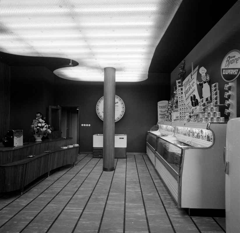 Bilden föreställer till vänster bänk i två nivåer eventuellt med kassaapparat på och en kruka med blommor. På höger sida skåp och hylla. Eventuellt frysskåp och på hyllan staplade konservburkar. Till höger skyllt med texten Bjäre djupfryst.