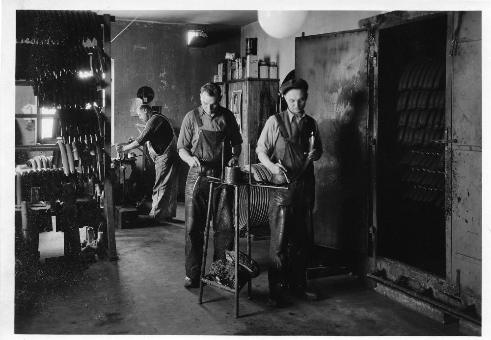 Svartvitt fotografi föreställande Cykelfabriken Kärnans hjulverkstad. På bilden ses män arbeta med tillverkning av cykelhjul. Männen bär arbetsklädsel. Hjuldelar hänger på rad till vänster i bild.