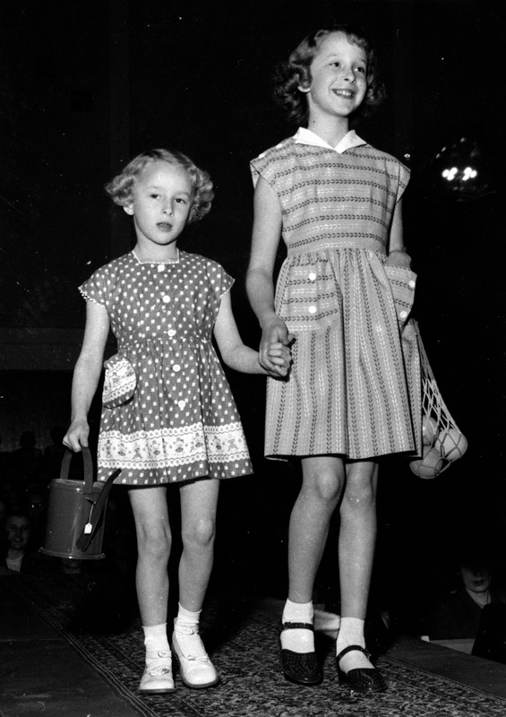 Systrarna Birgitta och Kristina Palm går mannekäng på H55. Kristina håller en vattenkanna i handen och Birgitta ett nät med bollar. AB Margita konfektion hade en egen monter ute vid Parapeten. Efter detta fick man nya kunder från hela Sverige.