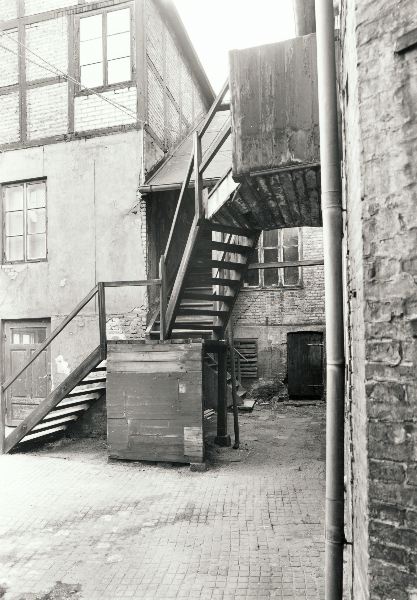 På bilden syns en gårdsinteriör med den delvis täckta trätrappan till gårdshuset på Södra Storgatan 33. Gårdsplanen är plattbelagd.
