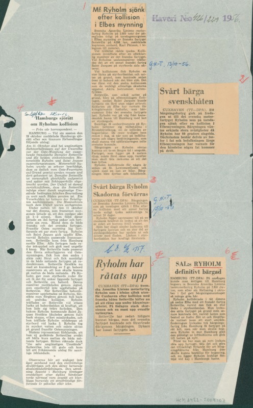 fartyget Mf Ryholm påseglades den 11/10 1956. Kollosionen skedde i floden Elbes mynning där det franska fartyget Sotteville manövrerade på ett sådant sätt att Ryholm vid sin undanmanöver kom att påseglas av ett tredje fartyg - Saint Jaques. Ryholm drabbades av stor läcka på styrbords sida och bogserades på grund men då ebb inträffade föll hon på babords sida. Det aktra lastrummet vattenfylldes. (nämnas bör att Ryholm flera år tidigare hade kolliderat på St. Lawrencefloden och där både sjunkit och sedan bärgats). Fartyget döptes 1958 om till M/S Carlsholm efter att det reparerats på Helsingborgs varf. Fartyget höggs upp 1972 i Spanien efter att det sprungit läck 1971.