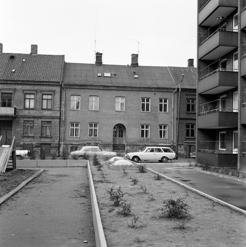 Bilden föreställer en stadsmiljö. I förgrunden klena buskar i en upphöjd plantering, innanför kantstenar. Till vänster en rutschkana omgiven av sand. I bakgrunden byggnader och parkerade bilar.