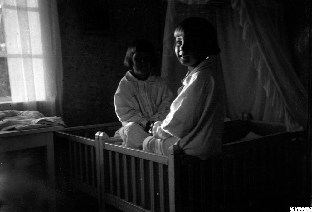 Bilden föreställer en hörna av ett rum där två barnsängar står intill varandra. I sängarna sitter två små flickor.