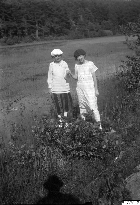 Bilden föreställer två kvinnor stående på en öppen gräsbevuxen yta. I bakgrunden skog. I förgrunden fotogarfens skugga.