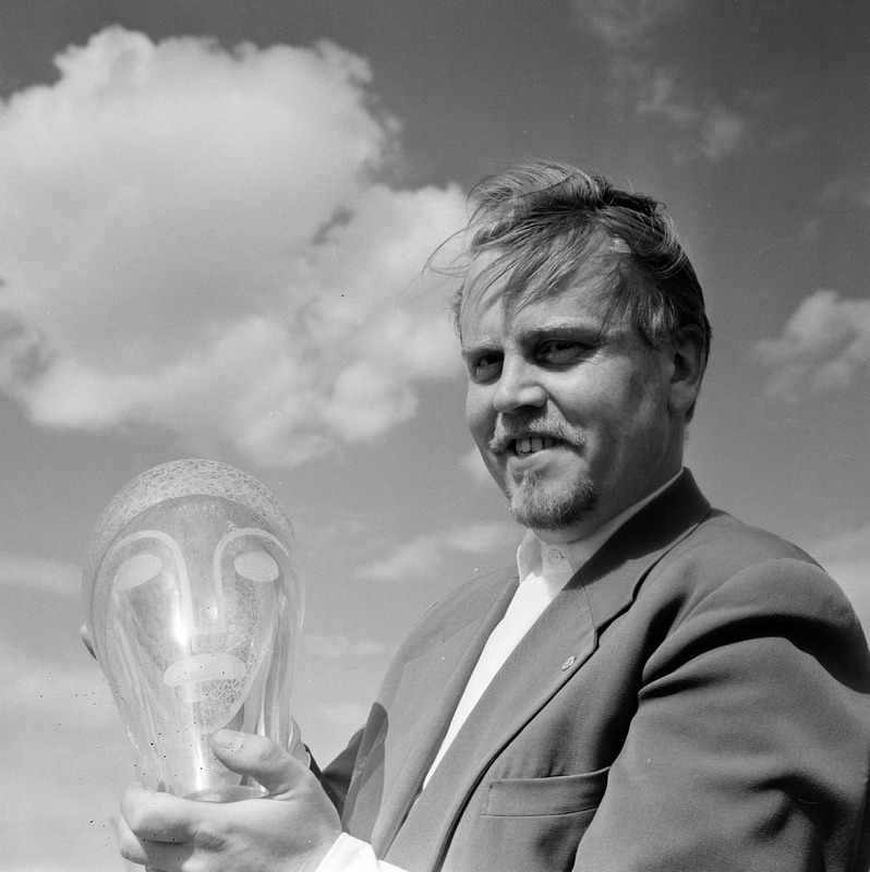 Bilden föreställer en man fotograferad i bröstformat. Mannen håller i ett dockhuvud.