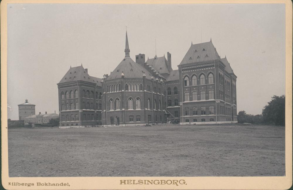 Det här är ett foto av baksidan av det Högre Allmänna Läroverket (Gossläroverket, senare Nicolaiskolan) när det var nybyggt (1898). Marken runt omkring är slät och bar. Man kan ana några personer inne mellan höger flygelbyggnad och mittdelen. Visst arbete ser ut att fortfarande pågå. Till vänster om skolan, i bakgrunden, syns det gamla barnsjukhuset (uppfört 1888-1889), som ligger på andra sidan Bergaliden. Till höger om skolan växer träd, som vid fototillfället bar löv.