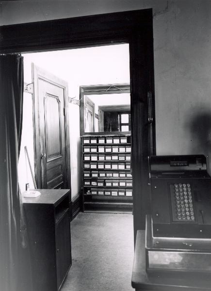 Bilden visar en del av interiören till Martha Persson- Hennings mottagning på "Gamlegård", år 1971. På bilden syns en kassaapparat till höger. På bilden syns även en förvaringsmöbel, och dörren till hennes läkarmottagning. I bakgrunden syns en förvaringsmöbel för patientjournaler.