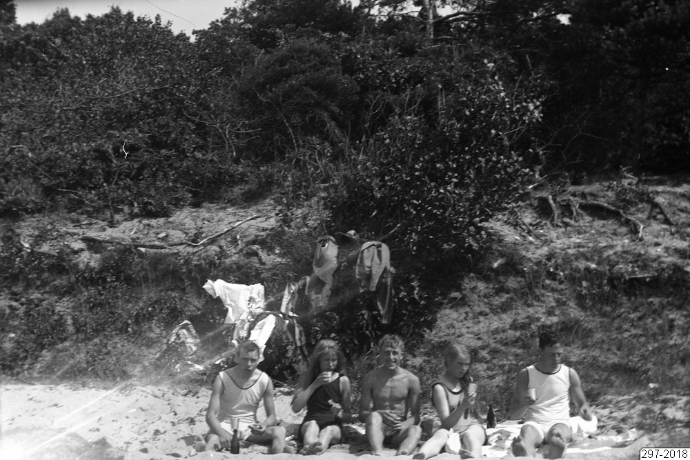Bilden föreställer fem ungdomar som sitter på en strand och äter matsäck. Dem är klädda i sommarkläder och i buskarna bakom hänger badkläder. I bakgrunden skog. Samma bild som 294-2018 men på längre avstånd och en person till.