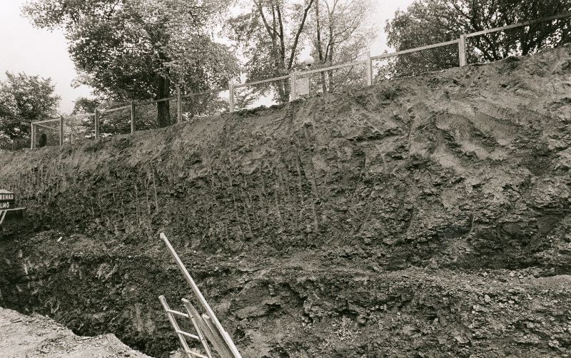 Bilden visar en schaktnings plats i öst-västlig riktning mot Bergaliden år 1971. På bilden syns spåren efter grävningsarbete med jordvallar och byggmaterial. Gräv och byggplatsen är omringad av ett staket mot en park som syns i bakgrunden.