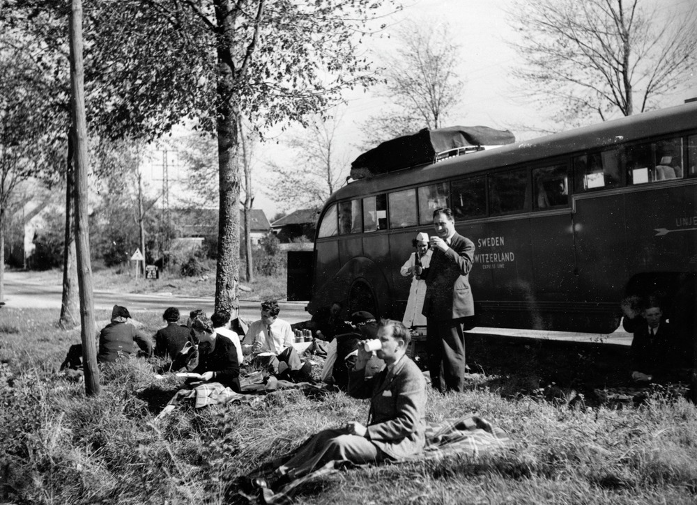 Fotografi av hur Linjebuss passagerare äter en måltid i gröngräset bredvid bussen.