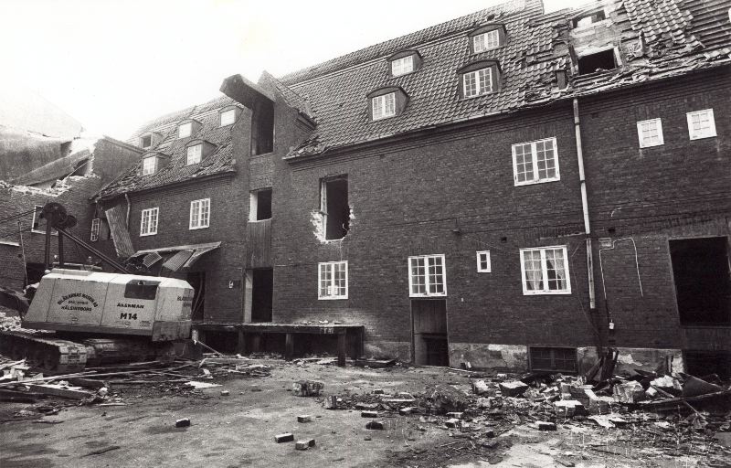 Bilden visar "Hofvendalska husets" innegård. På bilden syns en rivningsmaskin av typ Åkerman M 14, som hörde till Helsingborgs Bilåkarnas Maskin AB, år 1971.
