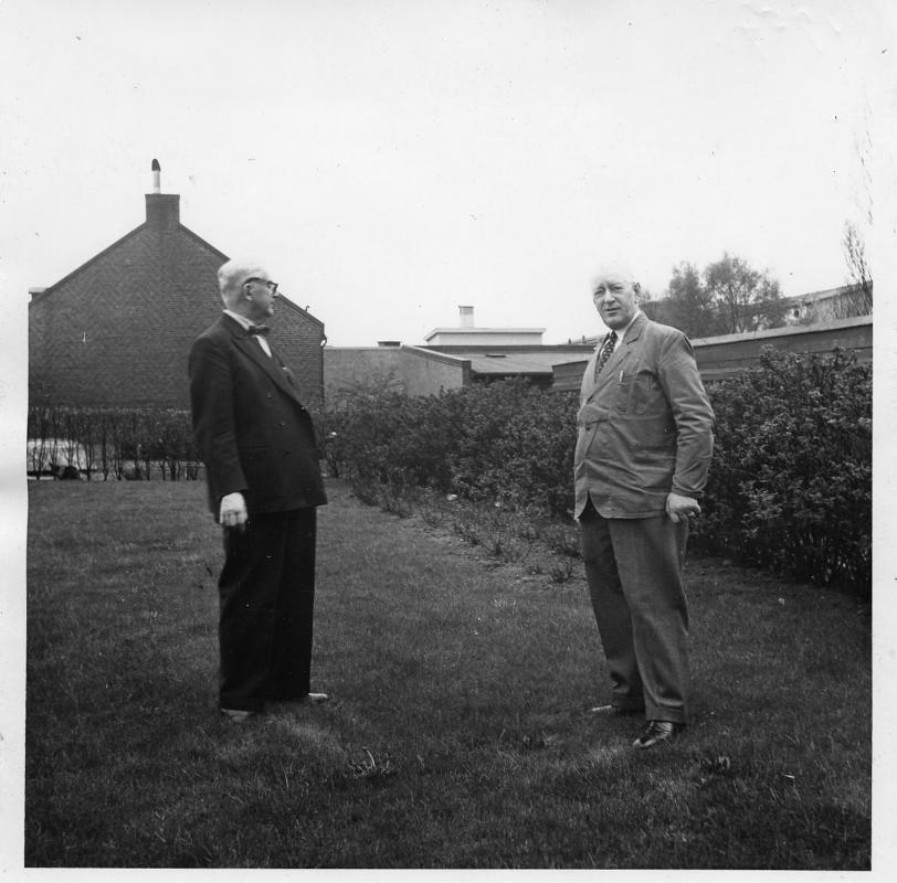 Svartvitt fotografi föreställande två män i kostym, ståendes på en gräsmatta framför en tegelbyggnad. Mannen till höger är Gustav Larsson, som vid tiden arbetade som vice VD för Cykelfabriken Kärnan.