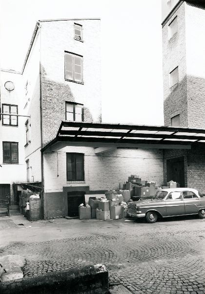 Bilden visar en gårdsinteriör på Södra Storgatan 9. På bilden syns bland annat ett sol och regnskydd, en parkerad bil och flera kartonglådor utspridda på marken mm.