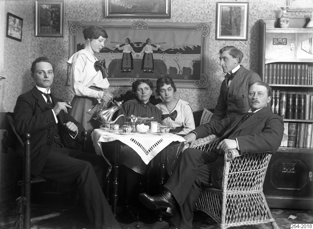 Bilden föreställer sex personer sittandes och ståendes vid ett bord i ett vardagsrum. Där är en korgstol och en munkstol (?). På bordet ligger en duk och där står troligen kaffekoppar och ett kakfat. I bakgrunden till vänster en bokhylla och på väggen rakt bak hänger olika tavlor.