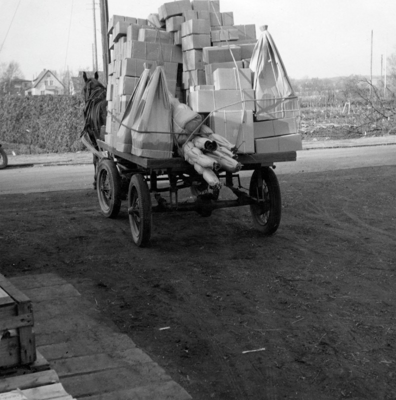 En vagn dragen av häst är fullastad med paketerade växter.Transporten gick till Raus station där den lastades på tåg för vidare transport till kunderna.