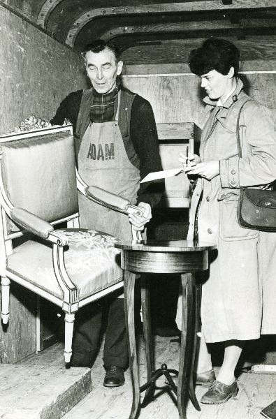 K Sommer och Margareta Weidhagen inspekterar möbler från Danmark på stadsmuséet.