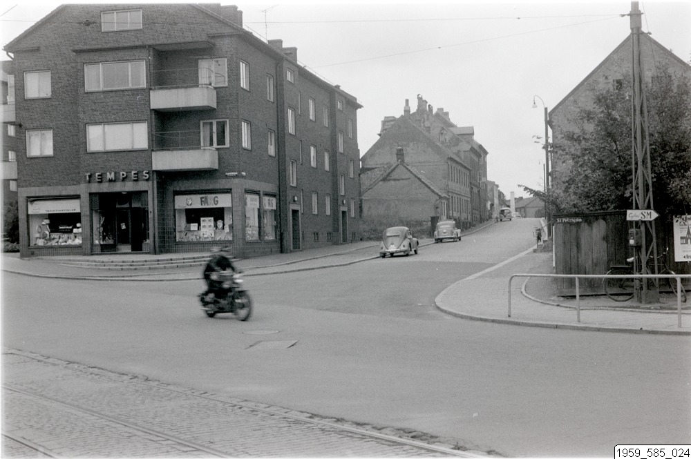 Bilden föreställer en stadsmiljö. I förgrunden en gatukorsning. Till vänster ett flerfamiljshus med affär på bottenvåningen. Skylt på huset TEMPES. I fönsterna står det toalettartiklar och FÄRG. På ett plank sitter en skylt med texten St Pedersgatan och på en skylt på en stolpe står det Cykel SM. Mitt i bild en man på moped och bak i bild två parkerade bilar. Bak i bild fler hus av olika höjd.