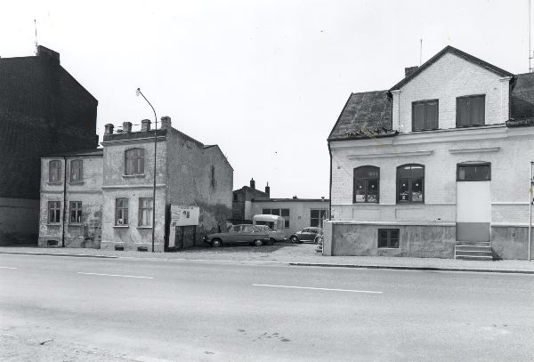 svartvitt fotografi föreställande bilar på gårdsplan med skylten "Malte Nilssons bil AB" och husbyggnader, Ringstorpsvägen 15-17, kvarter Borgaren år 1970.