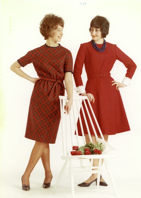 Två unga kvinnor poserar i kläder från AB Margita konfektion. Kvinnan till vänster är Birgitta Palm. Framför kvinnorna står en pinnstol på vilken det ligger en bukett tulpaner.