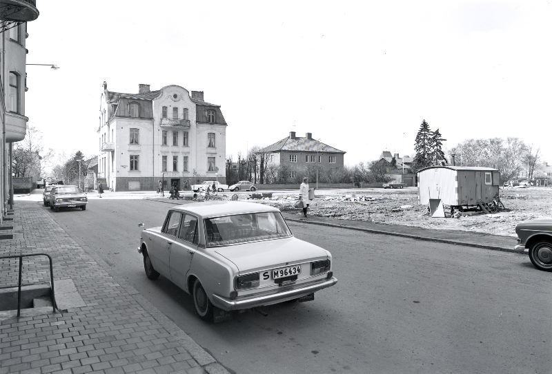 Aschebergsgatan-Karl X Gustavsgatan före de stora hyreshusen. På bilden står bilar parkerade och en kvinna står på trottoaren