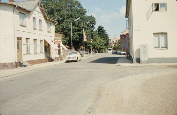 gatumiljö i Höganäs, I huset närmast ligger J Hult bageri. Längre ned på Allégatan skymtar Gruvtorget.
