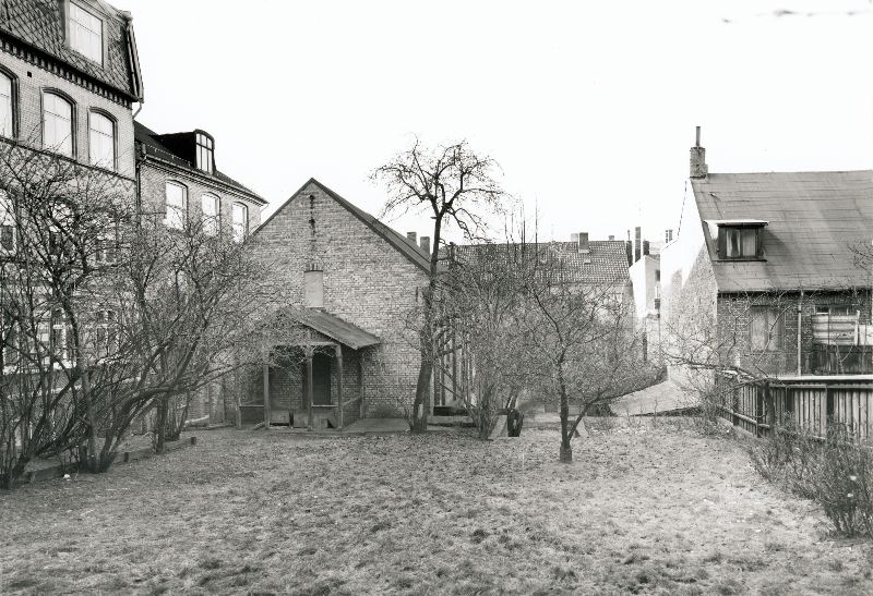 Bilden visar en gårdsinteriör på Södra Storgatan 13. På bilden syns bostäder på sidorna och längst i bakgrunden. Lite till vänster syns gaveln på ett uterum.