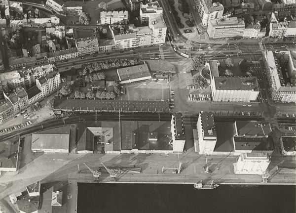 Flygbild över Drottninggatan, Norra hamnen och Konserthuset. På fotot står skrivet med tusch: "Fredag 4 juni kl 19.30-19.33"