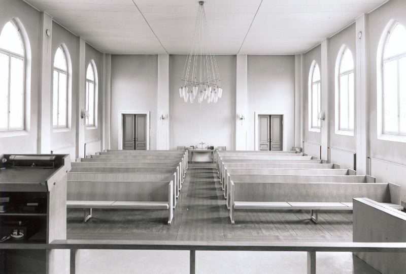 Bilden visar baptistförsamlingens kyrkointeriör mot ingången till salen. På bilden syns en del av altarskåpet, kyrkobänksrader, fönster med arkader, dörrar till ingången, vägglampor och i mitten av kyrkan en takkrona.