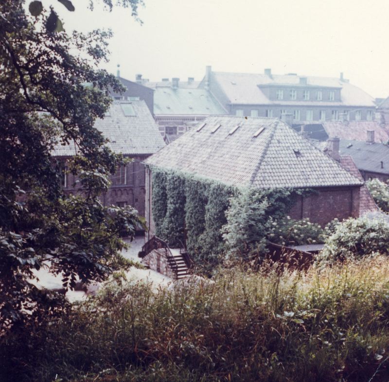 Vy mot Fågelhuset från Möllebacken. Gräs i förgrunden.