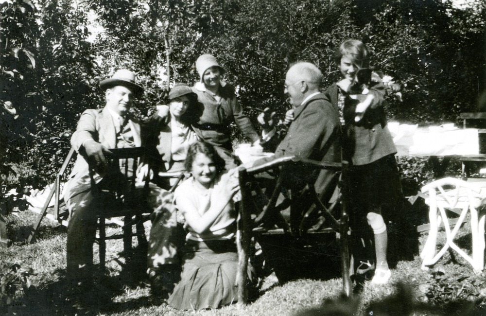Grupporträtt på följande personer från vänster: Johan Pålsson, Hedvig Pålsson, Clara Nilson, Gunnel Pålsson, Alfred B. Nilson och Inger Pålson. Bilden troligen tagen i Alfred B. Nilsons trädgård.