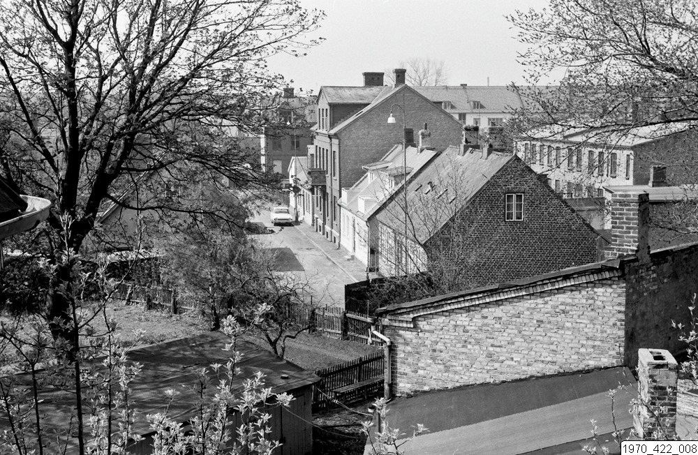 Vy över stadsdelen Stattena, med bebyggelse som idag är riven: Ladugårdsgatan.