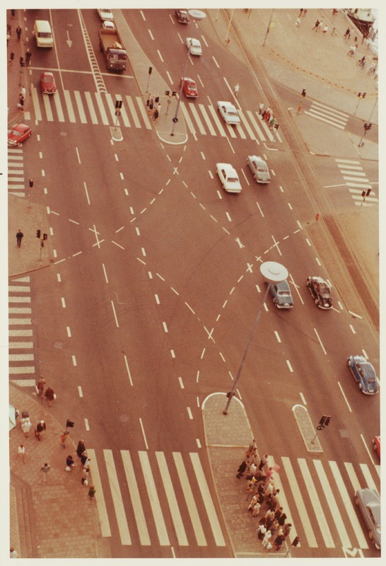 En fyrvägskorsning med trafilkjus och övergångsställe i fågelperspektiv. I korsningen kör bilar och människor går.